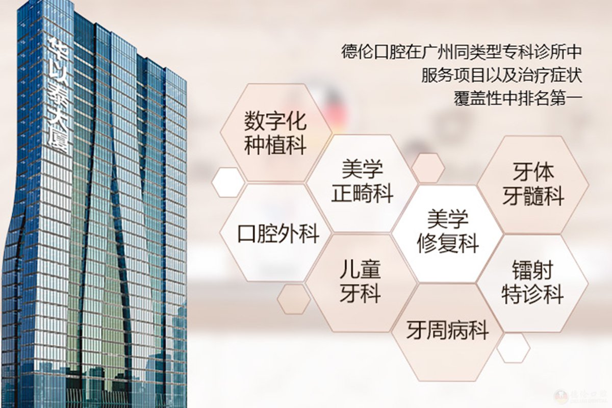 为让广大羊城市民获得优质口腔医疗服务,德伦东风旗舰店盛大扩业近10000㎡,成立种植科、正畸科、儿童牙科、牙体牙髓科、牙周病科、牙齿修复科、镭射特诊科、口腔外科八大科室,成为全广州口腔治疗项目更全面的口腔专科医院!在这里,各种缺牙难题、牙齿畸形、不同程度的牙周疾病等口腔问题,均能获得专业快捷的口腔治疗,尽快找回健康好牙!