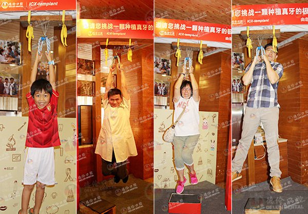 挑战方式:在5颗种植体组合起来的的承受力下,做引体向上运动,测试种植牙植体的负重极限。