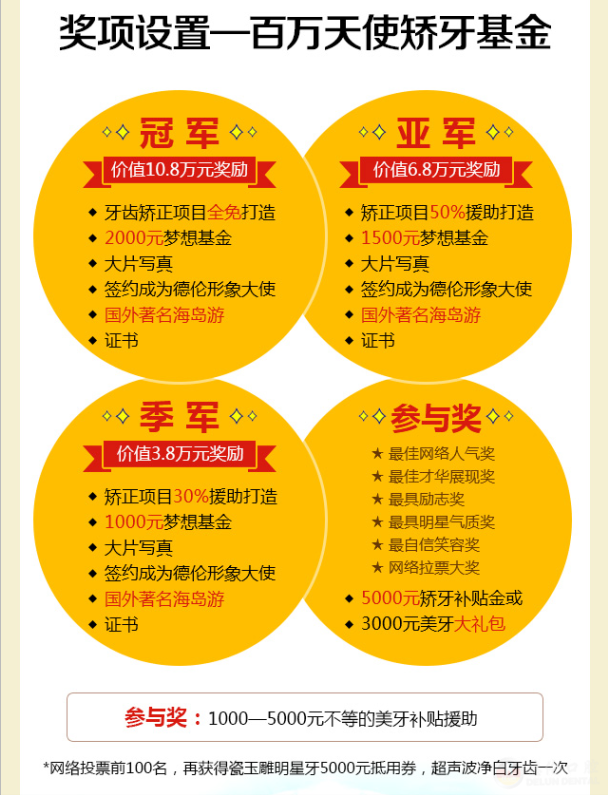 经过多家知名媒体的持续发酵报道,“第四届中国矫牙天使梦想秀”得到社会各界的强烈关注,报名人数正在持续增长中,“第四届中国矫牙天使梦想秀”招募仍在火热进行中,凡报名参赛均能获得1000-500的美牙补贴援助,优胜者还有机会享受矫牙等的丰富奖励,有梦想,你就来!