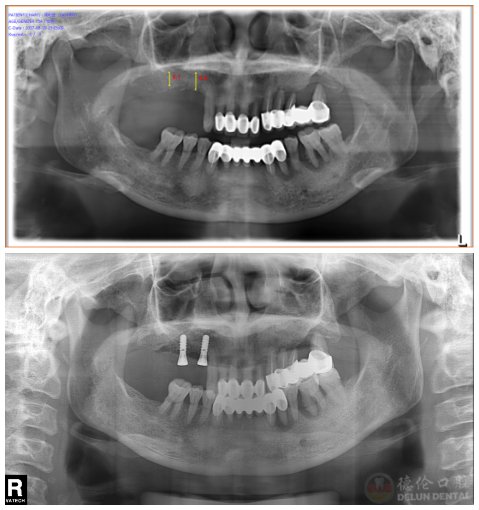 张阿姨手术前后对比照,于左上方种植2颗