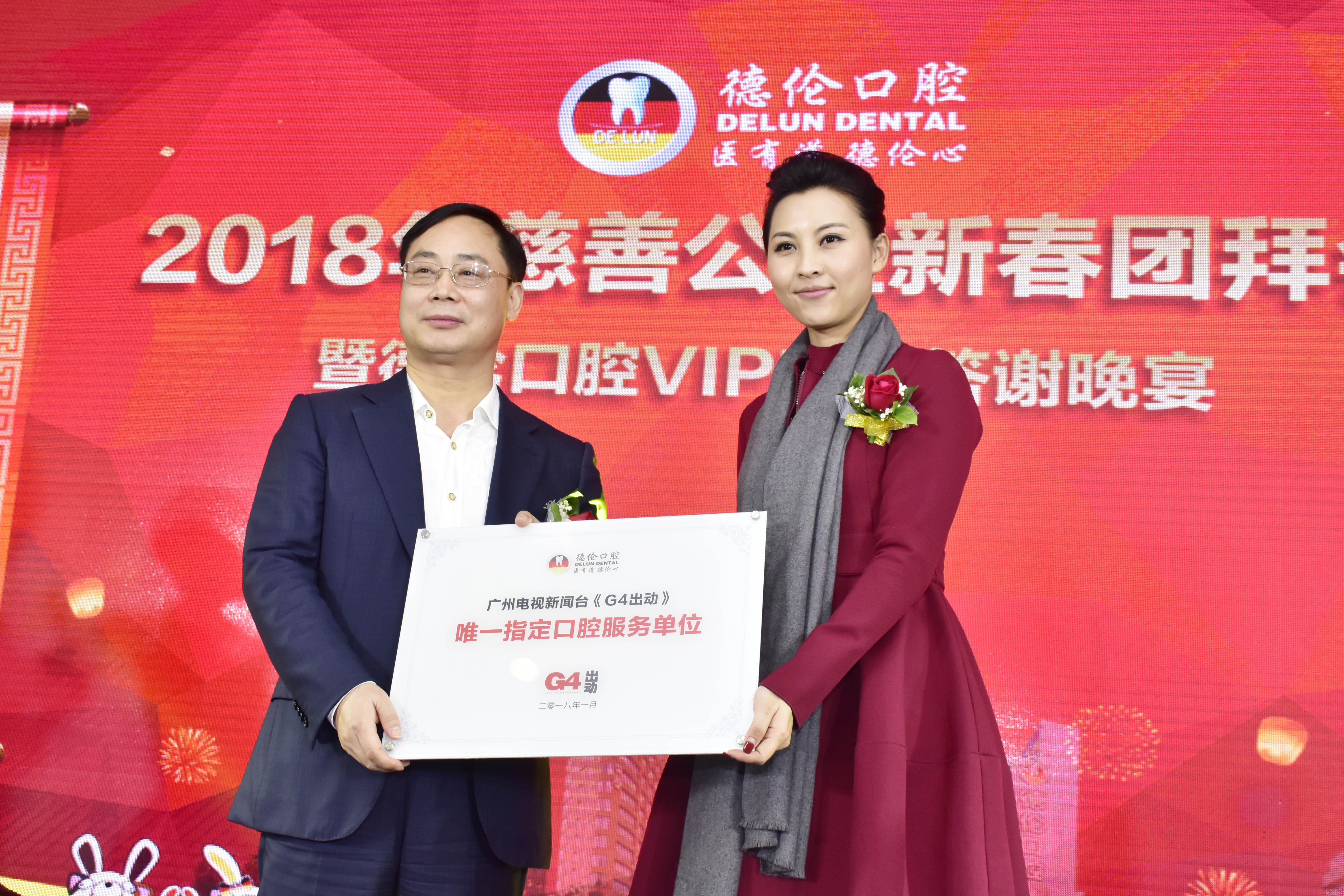 1月24日,《粤口腔 粤健康 》2018羊城口腔健康,公益普查万里行活动 正式启动。造福千万羊城市民,普及上万个家庭,派出千万个家管福利。广东金牌主持马志海、广州电视新闻台主播林洁、德伦口腔6大院长携手德伦口腔新老顾客相聚一堂,共同见证!民生新闻平台广州电视新闻台《G4出动》授予德伦口腔为为“广州电视新闻台《G4出动》指定口腔服务单位”。