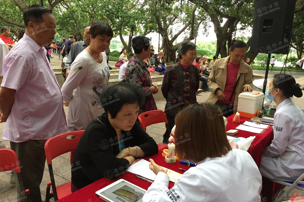 德伦口腔公益义诊服务团队走进越秀区流花湖公园,帮助市民建立健康的口腔环境,树立积极的口腔保健意识,附近街坊邻居闻讯前来参与。