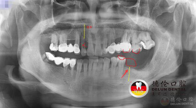 从李先生牙齿术前X光来看,李先生牙齿情况不容乐观,上颌、下颌均有缺牙,并选择搭桥烤瓷牙作为修复方式。