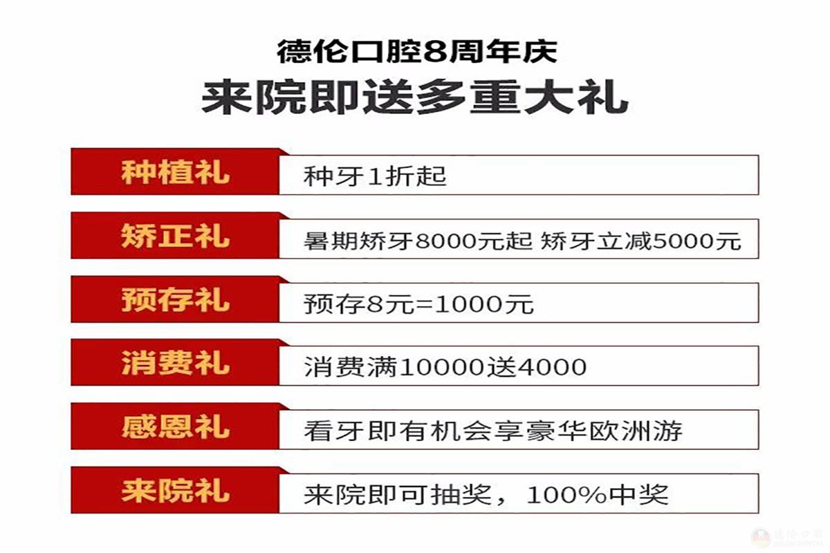 德伦口腔八周年之际,为了让更多的羊城街坊享受领跑行业、专业的欧洲齿科技术,我们推出了多重公益优惠活动: