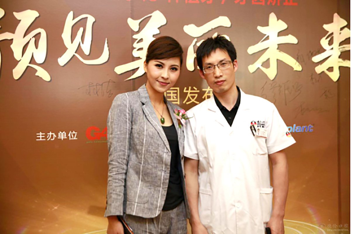 图为往届德伦口腔种植科专家李刚与《G4出动》著名主播林洁在种植牙直播活动合影