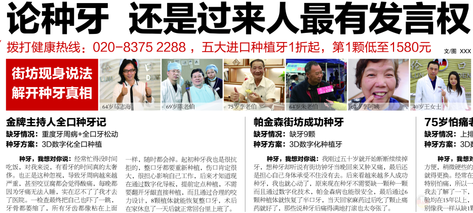 为了让广大缺牙市民早日完成种好牙享口福的愿望,全面解答广大市民种牙疑问,广州广播电视台《G4出动》联合德伦口腔,8月重磅推出“种植牙真人案例巡展”主题活动,邀约八年来在德伦口腔种牙的明星与街坊现身说法,分享种牙心得,教缺牙街坊如何选择种植体材料、医生、口腔机构等。即日起,市民报名种牙即可享受五大进口种植牙一折起,第一课158种牙钜惠。