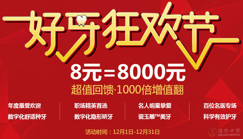 12月也是德伦口腔进入年终盛典答谢的月份,德伦口腔推出一年这一次的系列优惠活动。预存8元=800的抵用券,购买成功即可另享四重好礼,更有机会获得与十大明星共进超级晚宴的机会。报名矫牙可享受减免高达800的优惠活动。