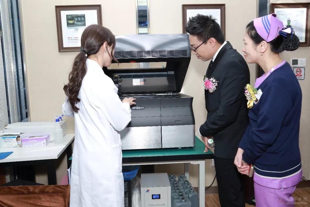图:德伦口腔医务人员向黄晓嘉先生展示数字化导板,德伦口腔会将导板赠与完成数字化舒适种牙的患者