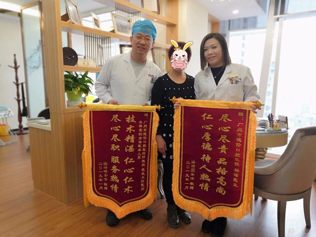 1月12日上午,修复缺牙一年余的吴女士再次回院,这回不仅仅是复查这么简单,她还带来了“秘密武器”——给德伦医护的表彰锦旗。“种完牙齿一年多了,感觉很好!所以趁着新年来院复查的送两面锦旗表达我的谢意,感谢程武主任及其医护团队让我重新拥有一口好牙!”
