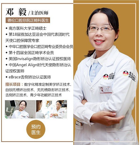 邓毅医生毕业于广州医科大学口腔医学院,南方医科大学正畸在职研究生。从事口腔临床工作10年余,曾赴广东省口腔医院进修,师从正畸名家,接受正畸专科培训,对正畸病例的设计、临床的操作熟练掌握。她理论知识扎实,临床操作质优快捷,责任心强,工作认真谨慎、严守医疗规则。积极参加国内外培训课程,认真学习矫正理念,取各种矫治方法优点应用于临床。