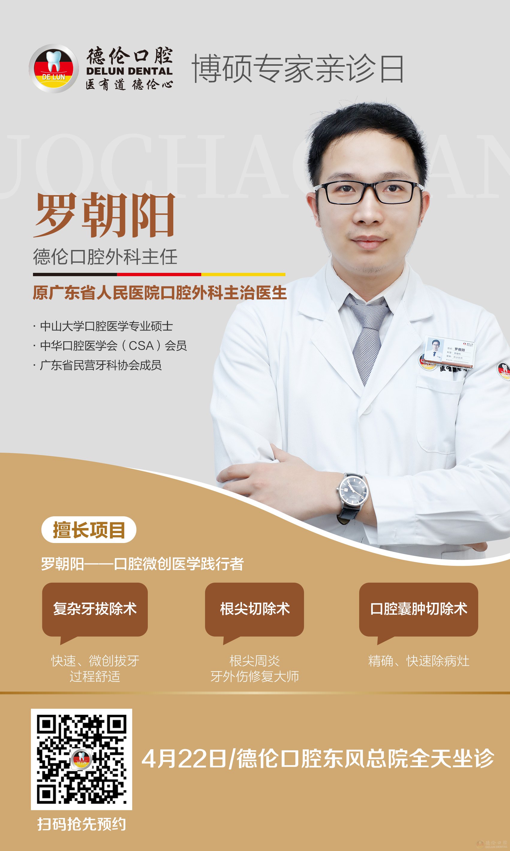 随着人们对口腔健康的关注度日益上升,许多人对口腔舒适治疗的需求也越来越高,牙齿歪歪扭扭可以拔吗?拔牙会痛吗?切除口腔囊肿可靠吗?……为解决广大市民的口腔难题,德伦口腔开展硕博专家团亲诊日,2019年4月22日,德伦口腔口腔外科主任罗朝阳在将开展一对一专家亲诊日,现全城招募口腔外科疑难案例。