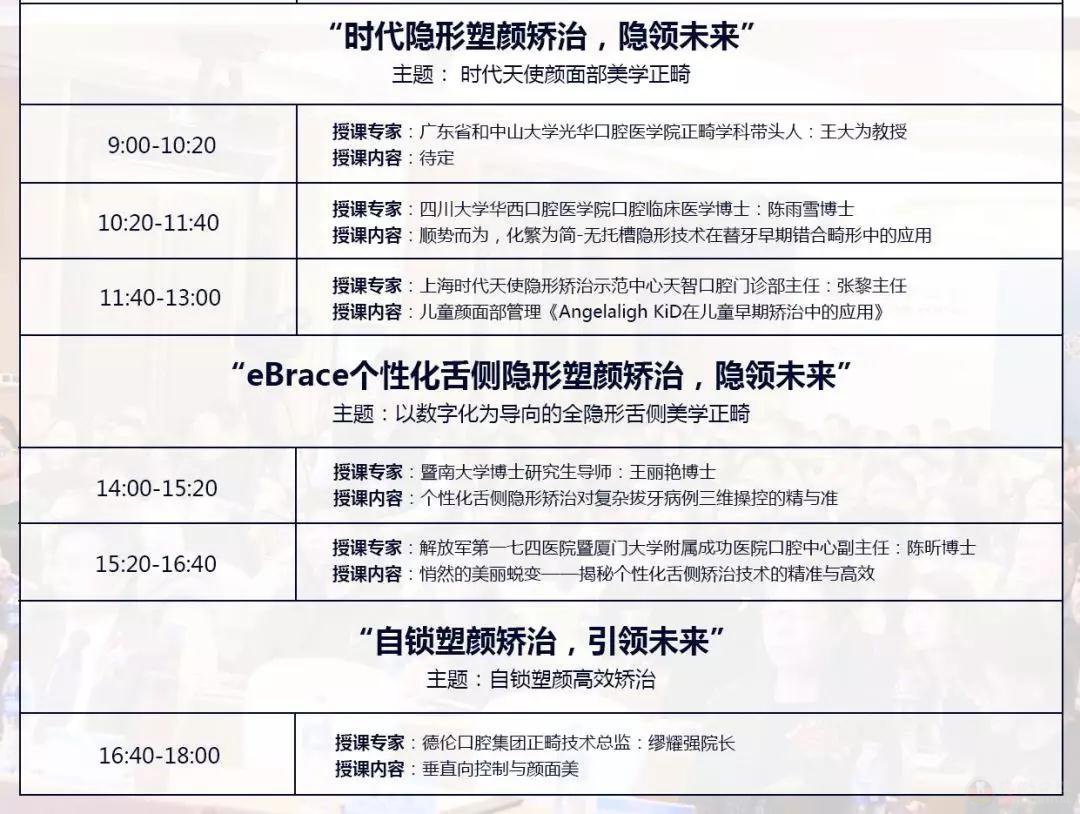 本届华南正畸科学高峰论坛作为国家级医学继续教育学分项目,首次将正畸学科的隐形矫治、舌侧隐形矫治,以及自锁矫治三大牙齿正畸方法在一届论坛中全部作为授课大主题。正畸领域20余位博士教授与300多位正畸医生在高峰论坛当天,将就“时代隐形塑颜矫治,隐领未来”,“eBrace个性化舌侧隐形塑颜矫治,隐领未来”,“自锁塑颜矫治,隐领未来”三大主题进行6场授课演讲,盛况空前。