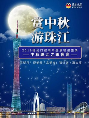 本次《2019德伦口腔周年感恩答谢盛典·中秋珠江之眼夜宴》活动,只要8月来德伦口腔看牙,消费满额即有机会获得珠江夜游豪华船票,观赏母亲河珠江两岸灯光璀璨的动人美景。同时,游船上还设置了猜灯谜、表演、互动游戏等环节,更有神秘明星嘉宾登场,惊喜多多,等你来。