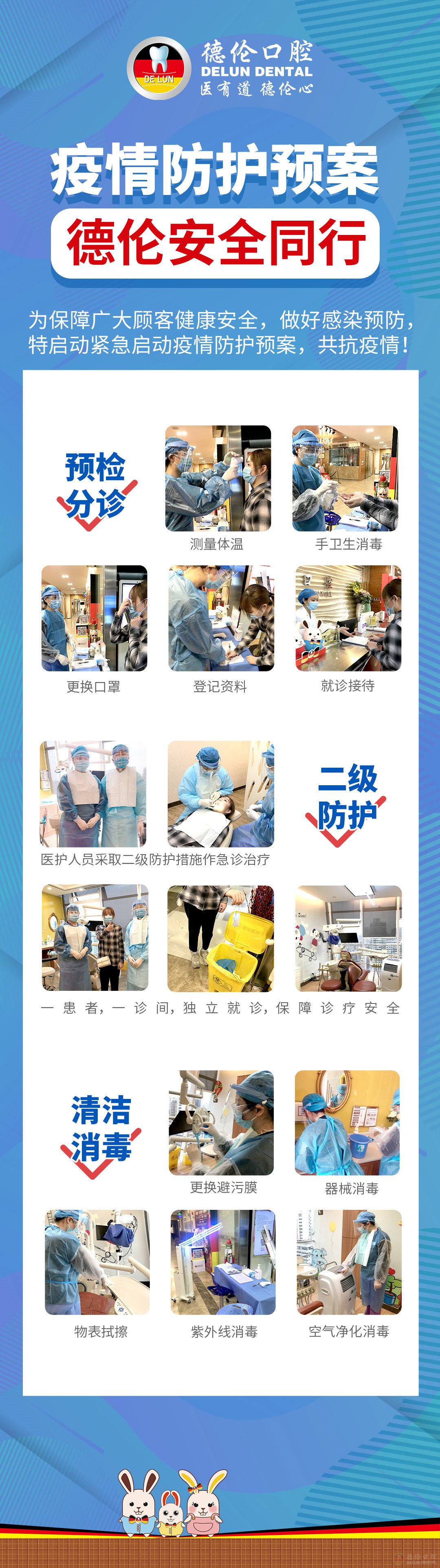 按照有关部门规定,可靠系数标准要求很高的是三级防护(加强防护),适用于疫情期间接诊疑似患者和亲密接触者,如目前武汉疫区的工作人员就要采取三级防护。德伦口腔采取的是二级防护(高级防护),适用于疫情期间口腔诊疗机构的预检分诊岗位人员、口腔急诊工作人员、进行产生气溶胶的口腔常规诊疗操作人员,足够保障诊疗顾客的可靠。