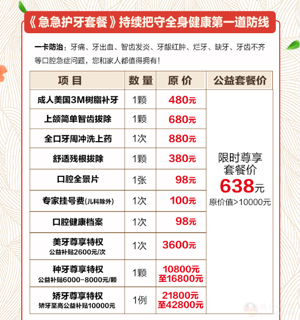 2、一卡防治——牙痛、牙出血、智齿发炎、牙龈红肿、烂牙、缺牙、牙齿不齐等口腔急症问题,您和家人都值得拥有!