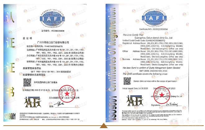 另一方面德伦口腔以ISO9001质量管理体系认证的方式,主动接受国家相关管理机构审查监督,并适时改善和规避医疗服务过程中的风险,把握提升医疗质量水平的机遇,以此不断促进医疗技术与诊疗服务融合发展,为广大口腔患者提供更加可靠、舒适、快捷的口腔健康诊疗服务。