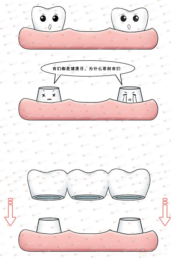 必须“牺牲”邻近的两颗天然健康的牙齿,把坏牙邻近的两颗牙齿磨小,制造一座和患者口腔情况相符的“烤瓷桥”,一颗牙齿坏了,却要损伤另外两颗好牙来补救它,代价太大。