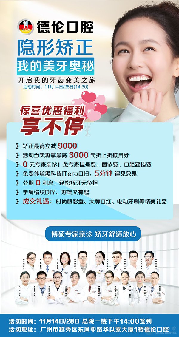 看到这儿,你是否对隐形矫正心动了,为提高牙齿正畸的治疗水平,加大对隐形正畸的认识,同时助你成功走出矫牙第一步,德伦口腔东风总院将于11月14日、28日举办我的美牙奥秘——隐形矫正活动,诚邀各位想要牙齿变整齐的小姐姐小哥哥参与! 我要报名参加隐形矫正活动>>