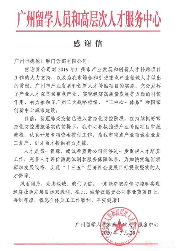 2019年度德伦口腔13位人才入选广州市产业发展和创新“人才”和“紧缺人才”,这是政府人力资源主管部门站在我市产业发展的高度对我院长期坚持人才为先、创新发展的高度肯定,也为未来我院持续加强培养和引进产业发展创新人才注入强劲动力。