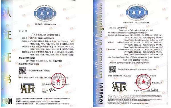 德伦口腔在十年如一日诚信经营中社会信誉不断增强,2020年获得“广东省守合同重信用企业”荣誉肯定,并成为广东地区少有的通过ISO9001认证的医疗机构,这是对德伦口腔品牌的认可和走向国际市场的开端。