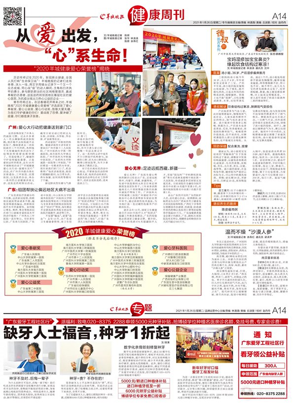 《羊城晚报》刊登2020羊城健康爱心荣誉榜,德伦口腔与三十多家三甲公立医院榜上有名