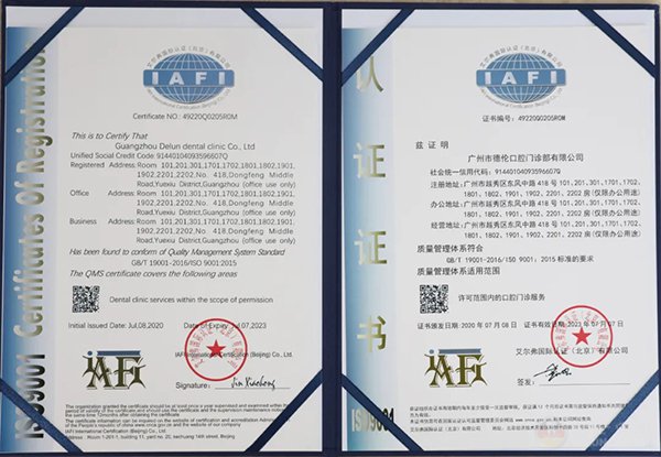 德伦口腔顺利通过ISO体系认证,获得由国际组织认定颁发的ISO9001质量管理体系认证证书