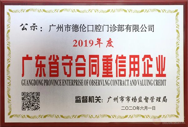 德伦口腔凭借在合同制度管理、合约履行能力以及企业社会信誉等方面优异表现,被授予“2019年度广东省守合同重信用企业”荣誉称号
