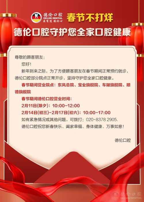 新年即将到来,德伦口腔作为华南口腔连锁品牌,春节期间不打烊,安排医生值班,为市民口腔健康保驾护航,守护您的口腔健康。
