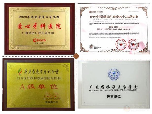 建院至今,德伦口腔凭借专业的技术与优质的服务,荣获爱心牙科医院”、“金牌医疗口腔机构”、“口腔医疗机构感染预防与控制A级单位”、“广东省临床医学学会理事单位”、“2019中国连锁民营口腔机构十大品牌企业”等各大政府机构及行业的荣誉资质认证。