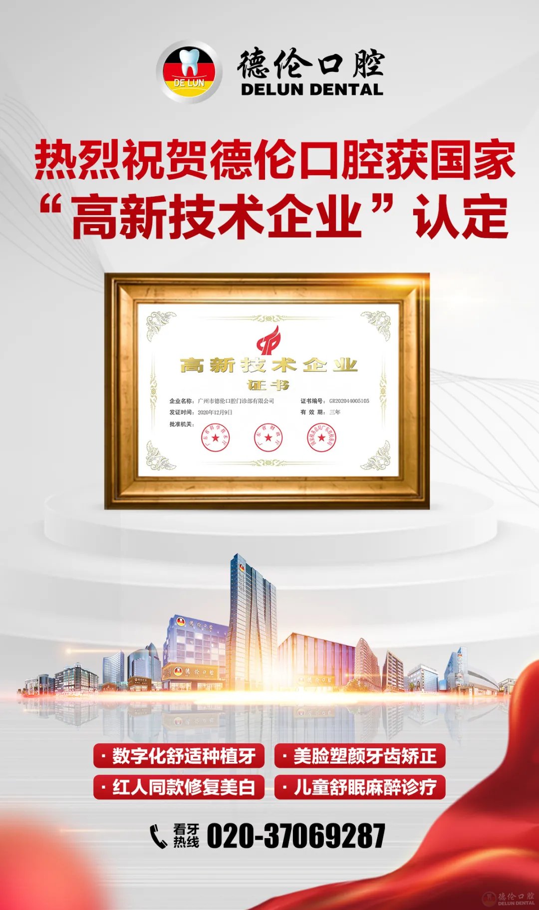 德伦口腔迎来重大喜讯,德伦口腔顺利通过由广东省科学技术厅、广东省财政厅、国家税务总局广东省税务局组织的国家高新技术企业认定,并荣获国家“高新技术企业”称号,由此正式迈入国家高新技术企业行列。这是对德伦口腔研发实力的肯定,更是德伦口腔发展史上的又一个里程碑。