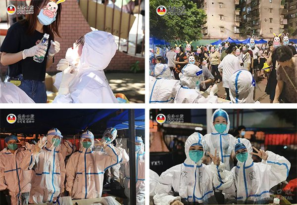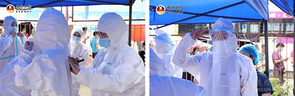 “还有新的防护服吗?脱了防护服就没新的了,这样我们团队会少一个人”这是德伦口腔一位医护人员出现中暑症状后说的话。“我不能喝太多水,上洗手间得脱防护服”,志愿者只能往她嘴里“倒”了点水。休息片刻,她再次投入到核酸采样工作中。