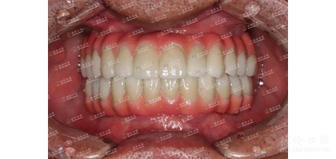 罗主任在刘叔上下颌各植入6颗种植体,术后当天取模,一周左右在植体上部搭配连桥冠恢复全口牙的生理功能。