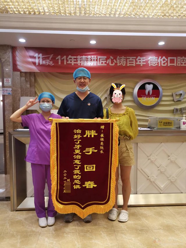 近日,刘女士将绣有“胖手回春,治好了牙更治愈了我的恐惧”锦旗赠与德伦口腔区庄/燕塘旗舰院技术院长崔保亮,感激与欢乐之情瞬间满溢了整个诊室。