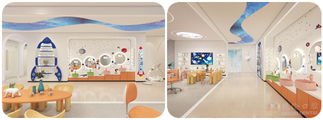 德伦口腔儿童口腔医院门诊别于传统口腔医院,门诊主体大楼整个色调以蓝灰为主基调颜色,墙面及顶面的图案及颜色符合儿童的喜好,色彩采用冷色调,如科技蓝、浅灰等,凸显出宇宙科技感,缓解就诊患儿不安情绪。