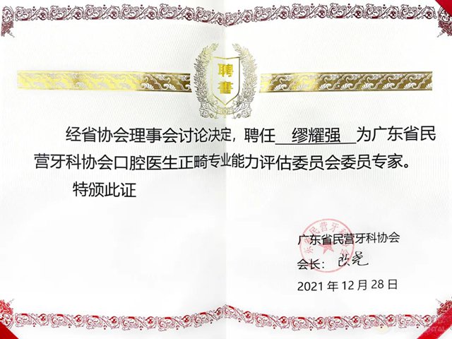 近日,广东省民营牙科协会口腔医生正畸专业能力评估委员会成立大会及正畸学术专场在广州举办,德伦口腔集团正畸中心技术院长缪耀强受邀出席,与全省各地的专家参会交流,并受聘为广东省民营牙科协会首批口腔医生正畸专业能力评估委员会委员专家。