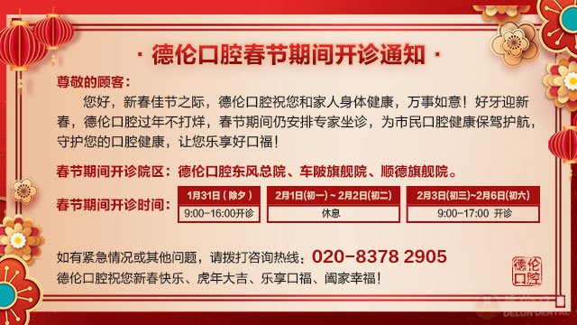 德伦口腔作为华南口腔连锁品牌,春节期间不打烊,2022年春节期间仍然安排专家坐诊,为市民口腔健康保驾护航,守护您的口腔健康。