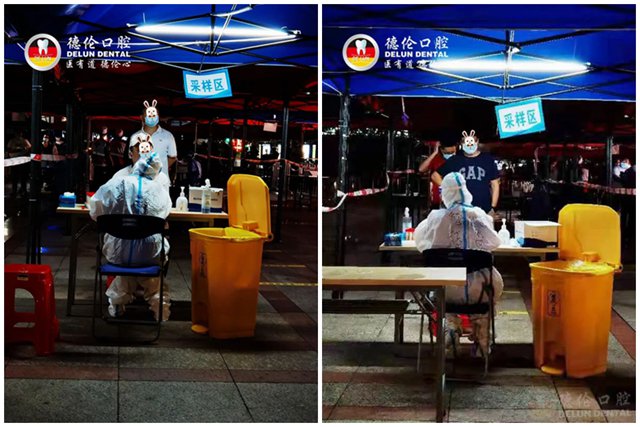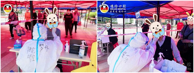 核酸采样点的德伦口腔医护团队穿着密不透风的防护服,坚守岗位为市民开展核酸采样,一丝不苟确保每一次采样准确无误。