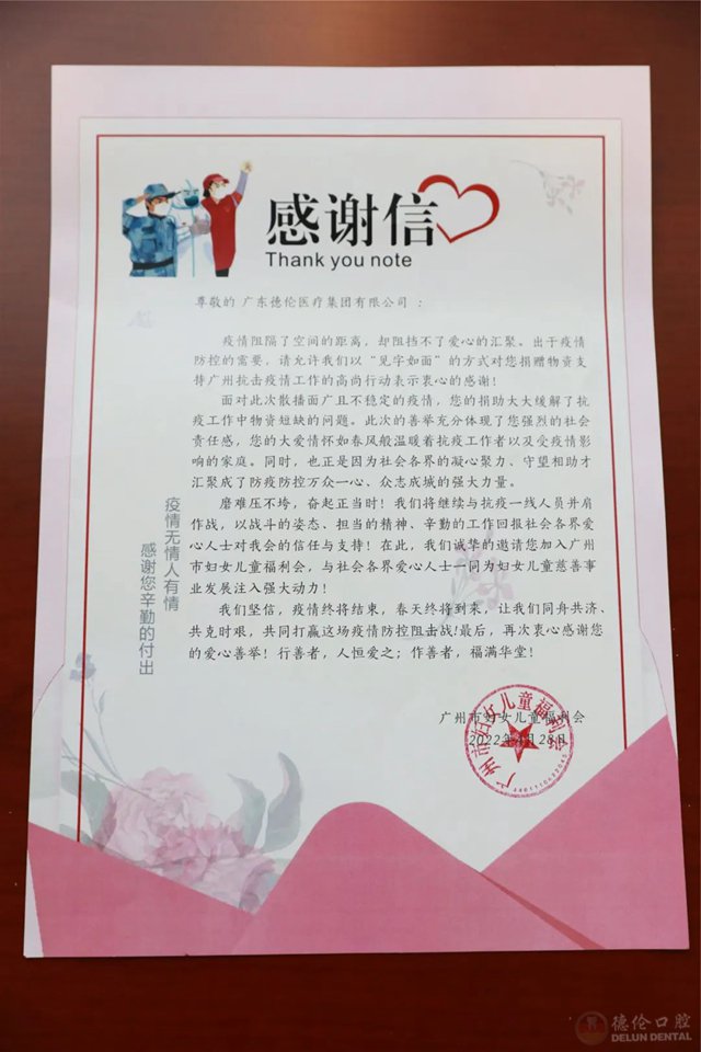 感谢信中广州市妇女儿童福利会对德伦口腔称赞道,“面对此次散播面广且不稳定的疫情,您的捐助大大缓解了抗疫工作中物资短缺的问题。此次的善举充分体现了您强烈的社会责任感,您的大爱情怀如春风般温暖着抗疫工作者以及受疫情影响的家庭。同时,也正是因为社会各界的凝心聚力、守望相助才汇聚成了防疫防控万众一心,众志成城的强大力量。”