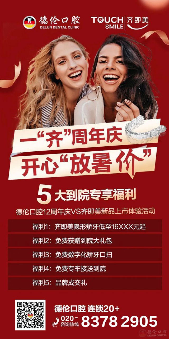 为了让广大市民都能拥有一口健康好牙,造福更多正畸患者,齐即美新品上市,德伦口腔作为TouchSmile大湾区临床示范中心,更恰逢德伦12周年庆,两大品牌联合向市民派发福利,来院可享5大福利,隐形矫牙立减万元、免费获赠爱牙礼包和专属礼品、免费数字矫牙口扫、免费专车接送到院、专享成交礼。