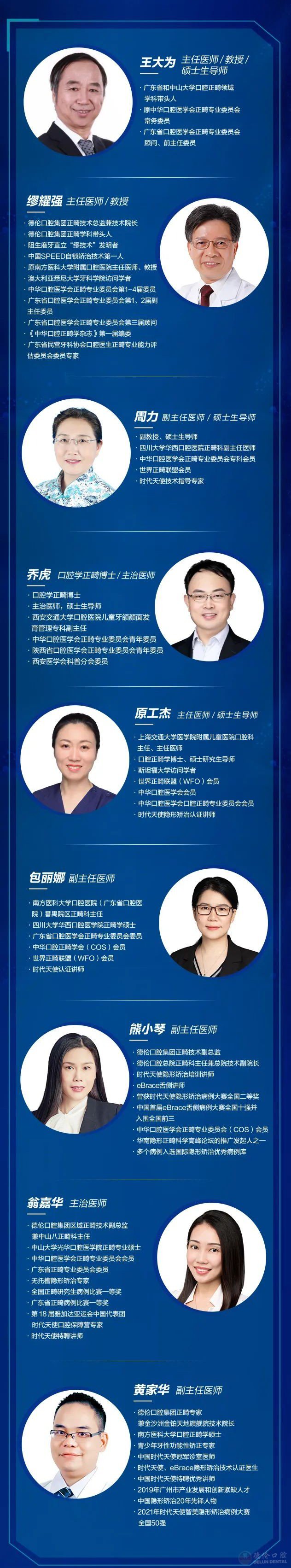 本届高峰论坛嘉宾囊括了多名当今国内口腔正畸界代表人物:包括广东省和中山大学口腔正畸领域学科带头人王大为教授;德伦口腔集团正畸技术总监兼技术院长缪耀强教授;四川大学华西口腔医院正畸科副主任医师周力副教授;西安交通大学口腔医院儿童牙颌颜面发育管理专科副主任乔虎博士;上海交通大学医学院附属儿童医院口腔科主任原工杰博士;南方医科大学口腔医院(广东省口腔医院)番禺院区正畸科副主任医师包丽娜医生;德伦集团总院技术副院长兼总院正畸科主任熊小琴医生;德伦集团区域正畸技术副总监兼分院正畸科主任翁家华医生;德伦口腔集团正畸专家兼金沙洲金铂天地旗舰院技术院长黄家华医生等口腔正畸医生通过线上方式进行授课演讲,同时来自全国各地的数千多名口腔正畸医师也在本次论坛上进行了学术交流。