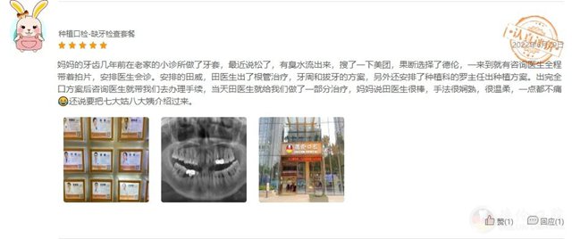 妈妈的牙齿几年前在老家做了牙套,说牙松了,要进行修复,搜索了一下果断选择了德伦。这里有工作人员全程带着拍片,安排的田医生做的牙周,另外还安排了种植科的罗主任出种植方案。