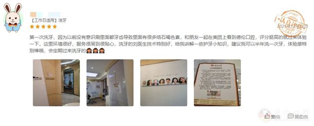 这里环境很好,前台服务很周到很贴心,洗牙的刘医生技术特别好,给我讲解一些护牙小知识,建议我可以半年洗一次牙,体验感特别棒哦,我会定期过来洗牙的!