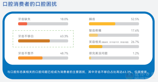 随着生活水平的提高,市民逐渐意识到口腔健康的重要性,根据《2020年口腔医疗白皮书》统计,牙齿不够白、牙齿不整齐、龋齿逐渐成为困扰消费者的三大口腔问题,其中,牙齿不够白的口腔消费者占63.3%。由此可见,牙齿护理不再局限于修补、拔牙这些基础医疗服务。