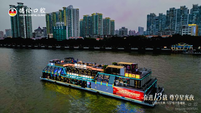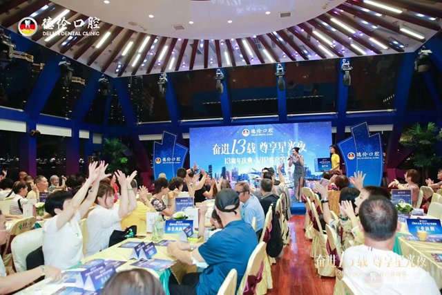 原来是德伦口腔在13周年庆典之际,为了感谢VIP客户的支持与信赖,承包了一整艘珠江游轮,邀请近200位VIP客户一同登上游轮,品美味佳肴与香槟美酒,看明星“大咖”的金曲串烧以及精彩魔术表演秀等精彩表演,共赏珠江夜游,共度星光之夜。