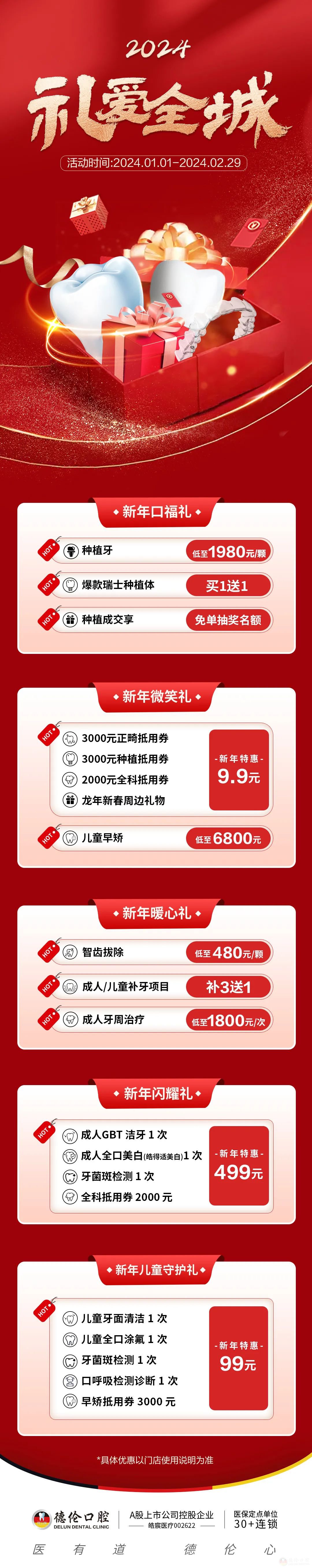 德伦口腔2024礼爱全城,新年盛启大献礼,一口好牙不缺席。德伦口腔推出新年五大口腔礼包,惠爱全城,持续守护!祝广大市民新年新气象!好牙好口福!