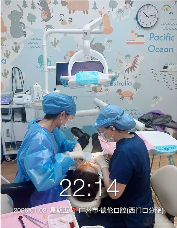 西门口院区:陈凯文医生与宋建香护士急患者所急,得知患者次日需返鄂,主动牺牲休息,加班至夜间十点,为其完成紧急补牙治疗,尽显德伦人的担当与温情。
