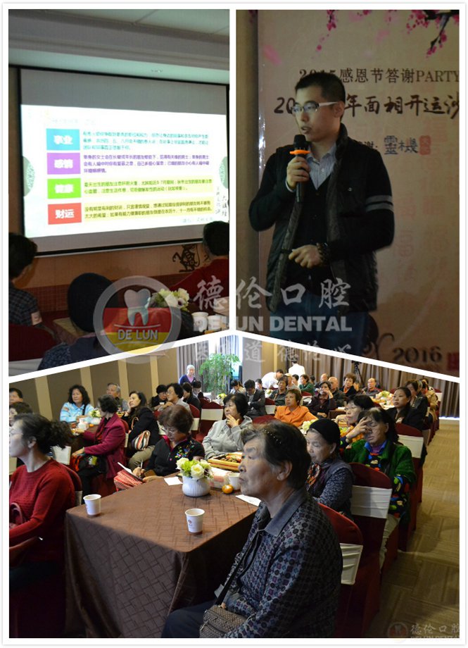 德伦口腔“2015感恩节答谢PARTY暨2016猴年面相开运沙龙”于11月26日下午2点隆重举行。现场座无虚席,参加活动的每位市民都期待自己在猴年能拥有好运势。