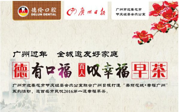 届时,赞助与支持单位--德伦口腔、种植专家卫衍加将进行“护齿养生”专题讲座,现面向全城招募百名广州市民一起迎接元旦,叹2016第一道幸福早茶。