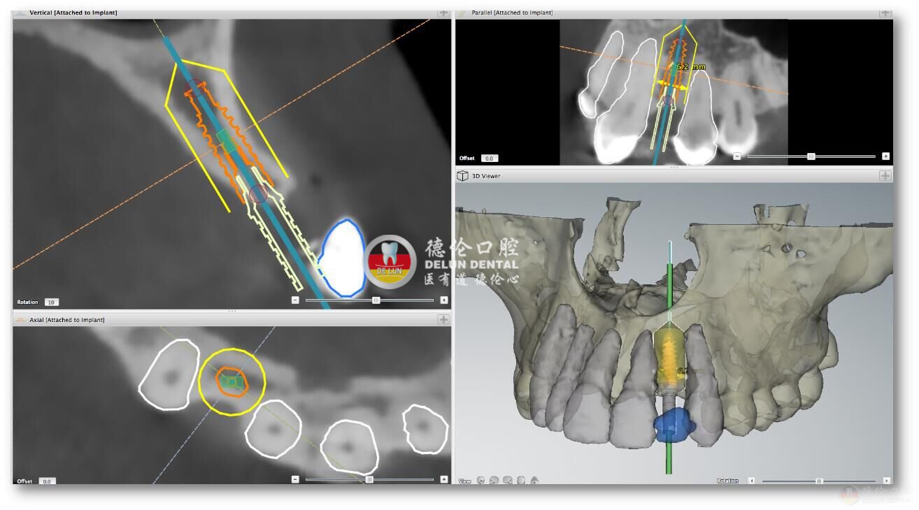 数字化种植牙的术前模拟设计,可以让医生手术前就清楚的看到前牙种植将要遇到的问题,比如:角度差值、骨粉植入多少、植体植入合适角度,医生可以在术前就研讨并设计出解决这些问题的方案,手术导板的定深、定位,定角度可以不单避免术中医生的失误,还简化手术过程,还大大缩短了手术时间。
