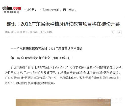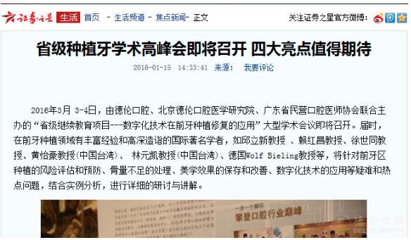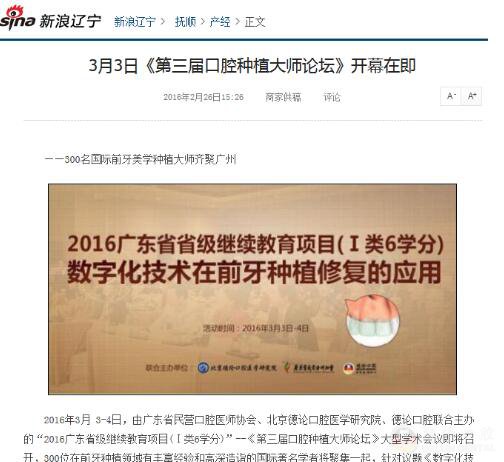 新浪网报道:“3月3日《第三届口腔种植大师论坛》开幕在即,300名国际前牙种植修复大师齐聚广州盛况”